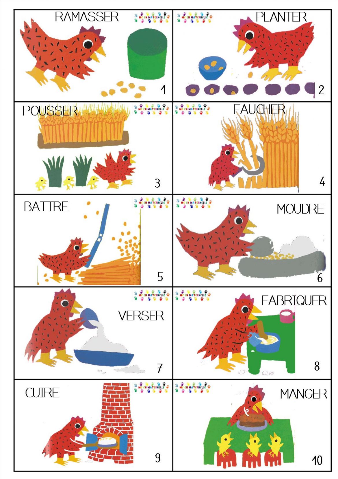 Pour bien comprendre l'histoire, vous pouvez utiliser les deux fichiers suivant qui reprennent le vocabulaire de l'album. Vous pouvez demander à votre enfant de nommer ce qu'il y voit, de les remettre dans l'ordre si vous les imprimer, de raconter ce que fait la poule, etc...